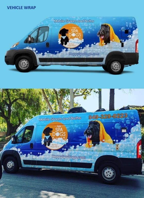 This mobile dog spa branding is brought to life through a brochure and vehicle wrap design, creating a playful, eye-catching presence on and off the road.